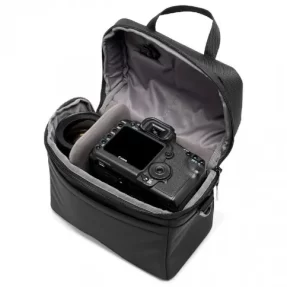 De tas is voorzien van een set verstelbare verdelers, waarmee je de indeling naar wens kunt aanpassen. Daarnaast beschikt de tas over een speciaal vak voor geheugenkaarten, batterijen en kabeltjes, zodat je accessoires veilig en overzichtelijk opgeborgen zijn. Aan de voorkant bevindt zich een riem waarmee je een klein statief gemakkelijk kunt meenemen.